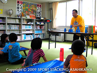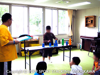 名人に挑戦!と題した「スポーツスタッキングのワークショップ」で